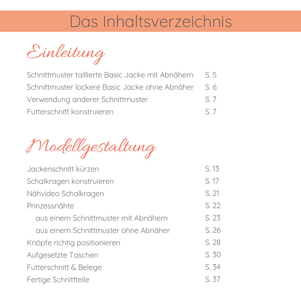 Alle enthaltenen Anleitungen kannst du auf meine Schnittmuster "Taillierte Basic Jacke mit Abnähern", "Lockere Basic Jacke ohne Abnäher" und sogar auf das "Basic Dress" anwenden (Basic Schnittmuster sind nicht im eBook enthalten).
